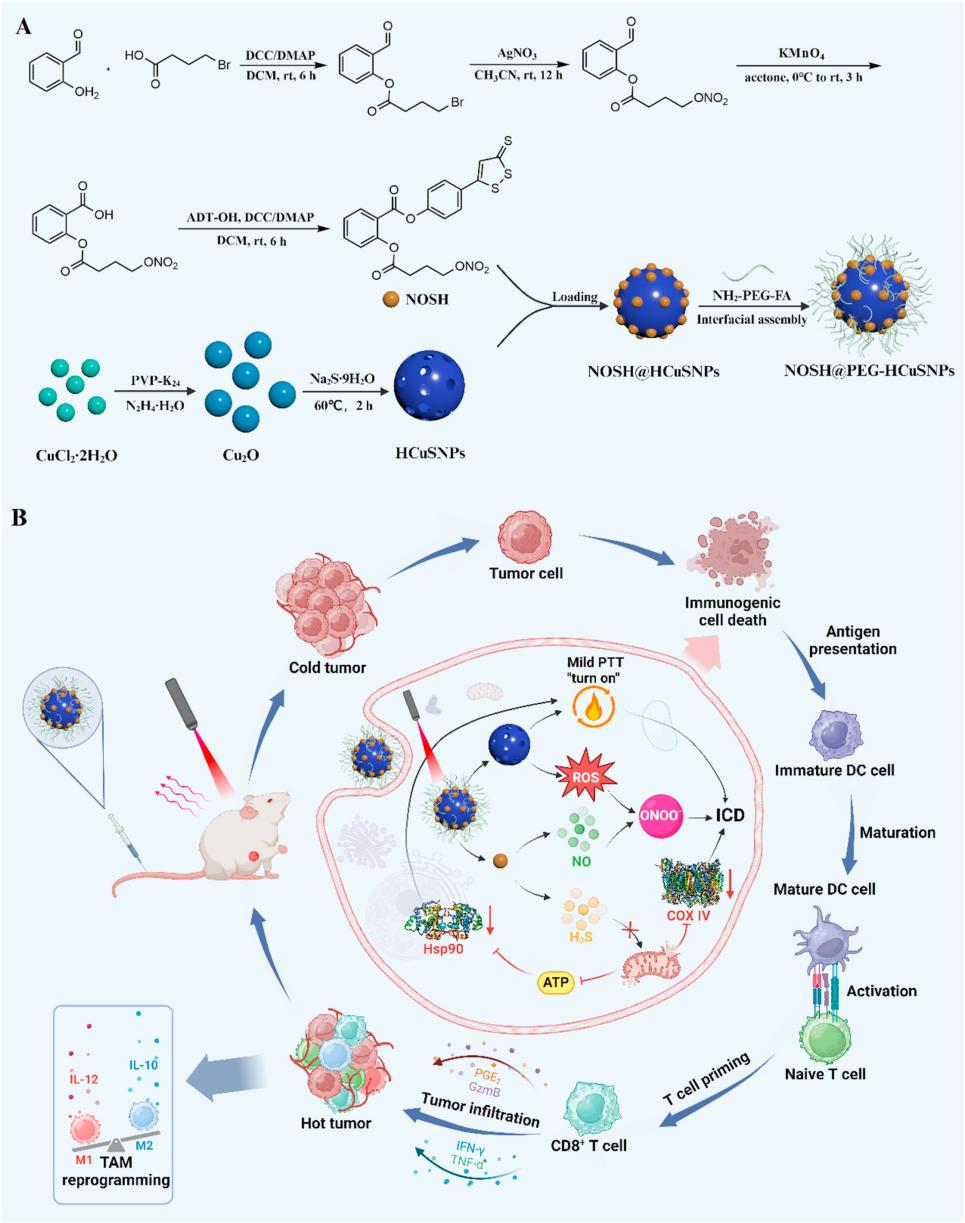 基于以上背景,该研究团队合成了能按需释放H2S和NO的气体信号分子供体NOSH,加载到具有近红外光(NIR)吸收能力和表面改性过的空心介孔硫化铜纳米颗粒中,以获得可编程纳米马达NOSH@PEG-HCuSNPs。研究发现,NOSH@PEG-HCuSNPs可以有效地实现NOSH和HCuSNPs的时空同步共同递送,从而发挥GT和轻度光热疗法(mPTT)的协同效应,即GT通过破坏线粒体呼吸链、抑制ATP产生和促进肿瘤细胞凋亡,有效增强mPTT的抗肿瘤反应。mPTT产生的ROS和NOSH释放的NO相互作用会产生大量的过氧亚硝酸盐阴离子(ONOO−)自由基杀伤肿瘤细胞。同时,利用H2S独特的保护机制,通过减少热休克蛋白90(HSP 90)的过表达来诱导肿瘤热消融,最大限度地减少对正常组织的不必要损伤。最后,mPTT、ONOO⁻自由基和H2S的级联效应显著增强了ICD。另外,免疫抑制性肿瘤微环境被重新编程,有效抑制了远处肿瘤组织并防止转移和肿瘤复发。综上所述,本研究为肿瘤治疗领域的创新提供了一个新的视角。