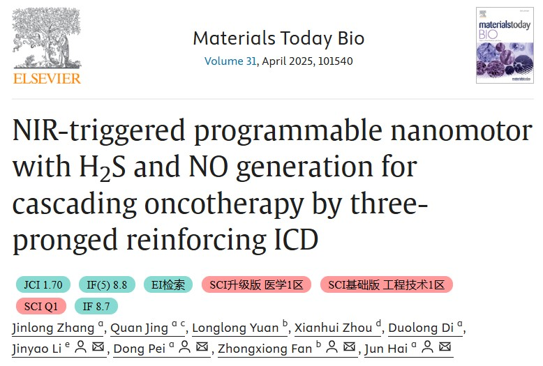 2025年2月1日,新疆大学李金耀教授和范仲雄副教授联合中国科学院兰州化学物理研究所海军研究员等在国际知名期刊《Materials Today Bio》(中科院一区)在线刊发了题为“NIR-triggered programmable nanomotor with H2S and NO generation for cascading oncotherapy by three-pronged reinforcing ICD”的研究成果。