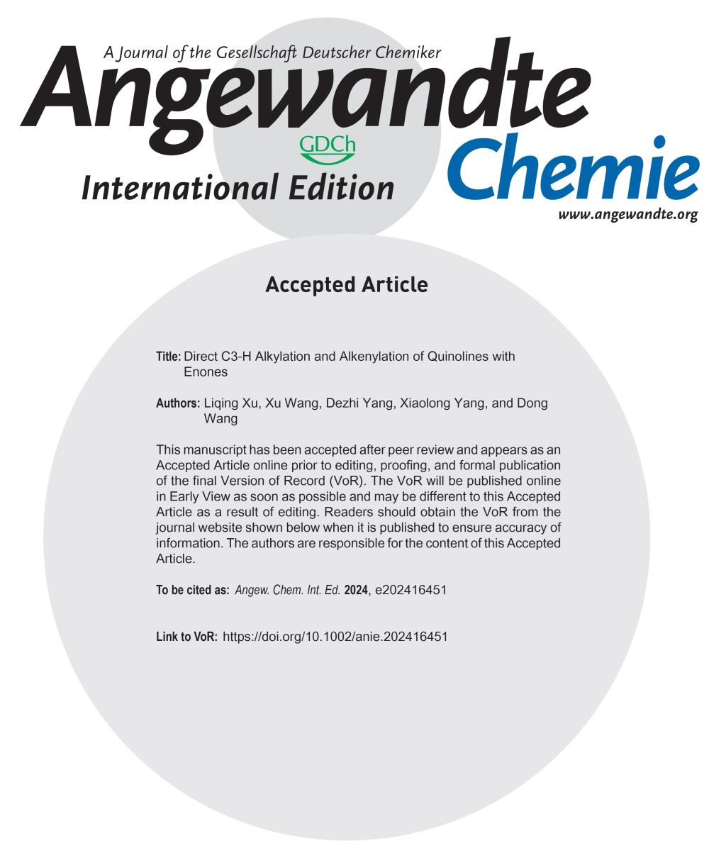 献礼我校百年校庆!!!近日,我校药学院王栋教授课题组,通过去芳构化-酸促进的亲电取代反应及消除反应策略,实现了喹啉3-位的直接烷基化及烯基化反应,相关研究成果以“Direct C3-H Alkylation and Alkenylation of Quinolines with Enones”为题发表在国际著名期刊 《德国应用化学》(Angewandte Chemie International Edition)上。