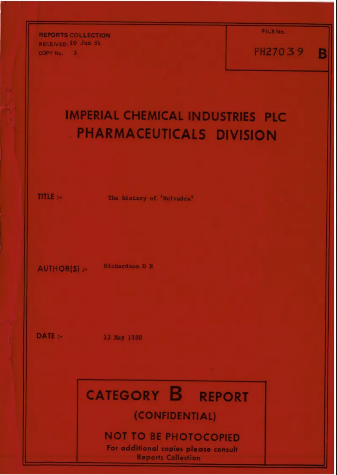 2000年,一位名叫薇薇安·奎克(Viviane Quirke)的医学史博士后在研究慢性病药物历史时,意外地发现了多拉•理查森(Dora Richardson)这个名字。当时,ICI公司制药业务部门已经与阿斯利康合并,但相关档案资料仍留在ICI公司总部内。她来到这里查阅资料,档案管理员给她了一份题为“The History of Nolvadex”的珍贵文件,足有70页;Nolvadex即他莫昔芬的首个品牌名称。这份文件由理查森在1980年退休之际撰写,详尽地记录了她在研究他莫昔芬时的感受和对未来的希望。这份文件从未公开发表,她仅将其与多年的手写笔记一并转交给了当时公司的档案管理员。遗憾的是,由于在归档过程中的一个文书失误——未能将“Nolvadex的历史”这一关键词包含在内,使得这份文件在过去二十年里一直未被世人所知[4]。甚至理查森还在1988年写过一篇简短的论文介绍技术流程,这篇论文也被封存在公司档案中。如今,随着这些文件重见天日,理查森关于他莫昔芬开发的故事也终于得以被世人所了解。